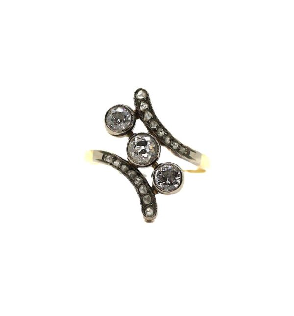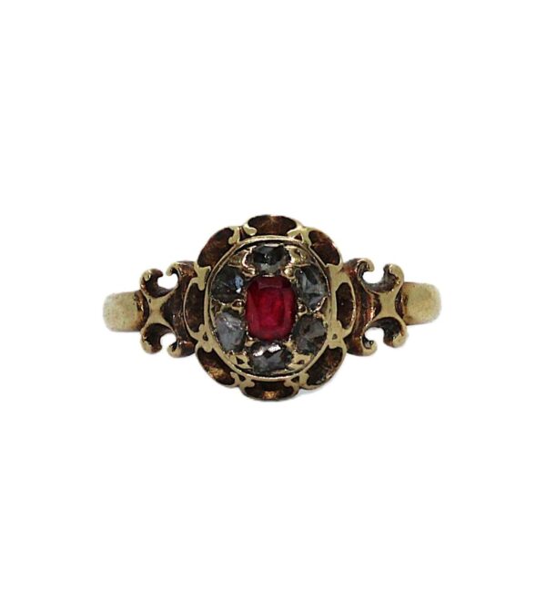 Zlatý secesní prsten s diamanty a rubínem