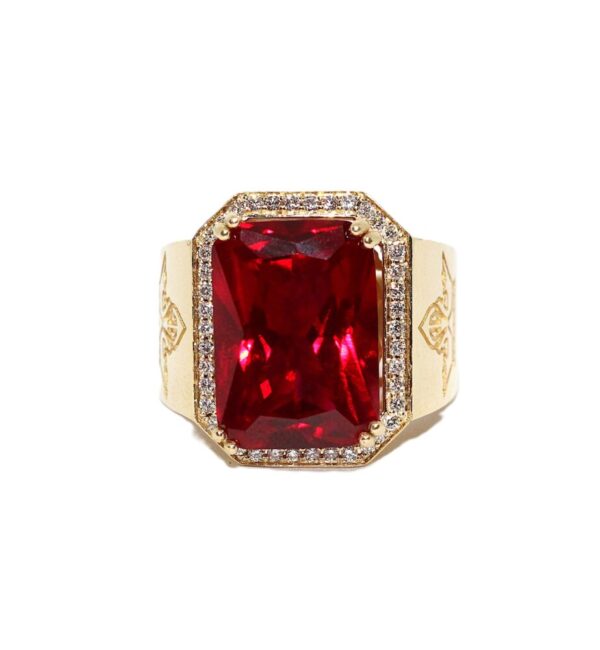 Velký zlatý prsten s brilianty a červeným kamenem