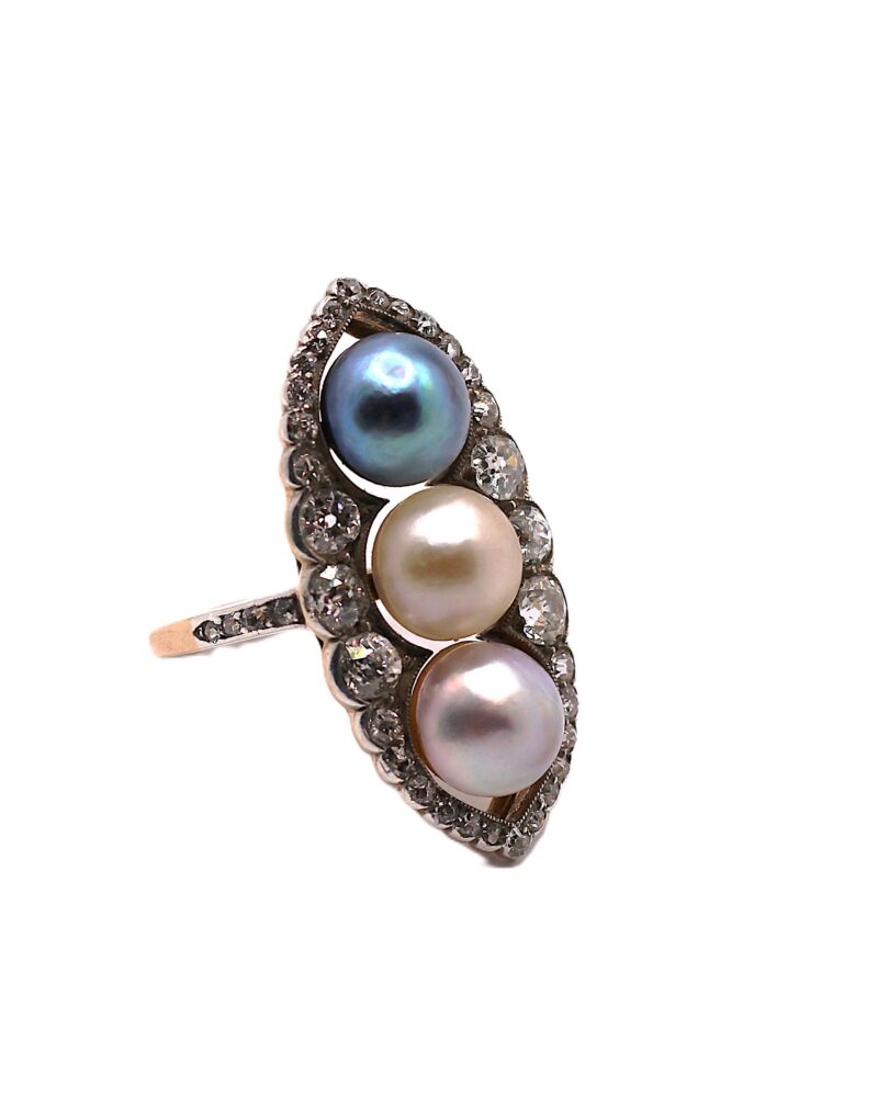Luxusní, zlatý prsten s brilianty a perlami, secese