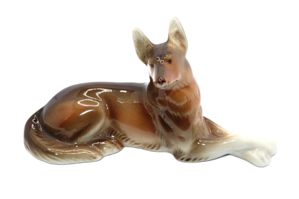 Porcelánová soška – pes, zn. Royal Dux, výška sošky je 14,5 cm, výška je 8,5 cm.