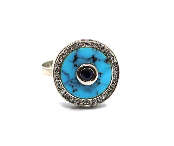 Zlatý prsten s tyrkysem, brilianty a safírem, bílé zlato