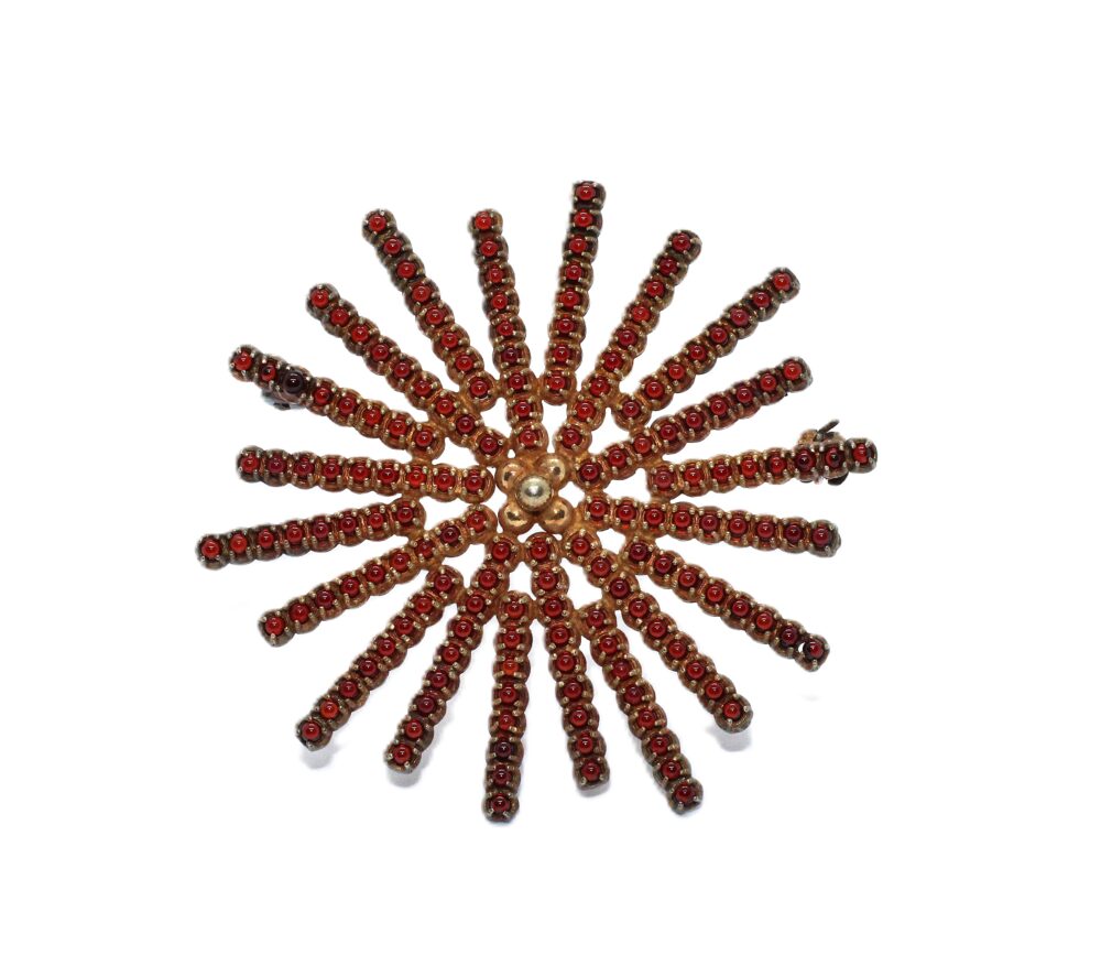 Stříbrná, zlacená brož s českými granáty, ryzost stříbra 900/1000, váha 9,16 g, průměr brože je 4,5 cm.
