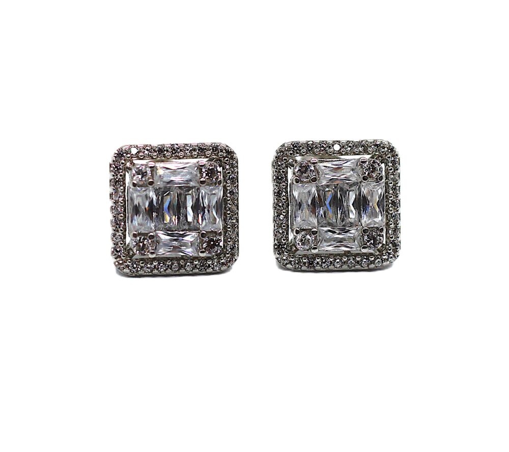 Stříbrné náušnice se zirkony, stříbro ryzosti 925/1000, váha 3,69g. Velikost ozdobné části 1,2cm. Zapínání na puzetku.