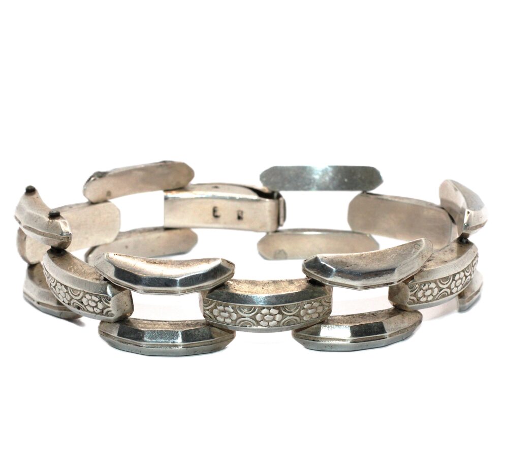 Stříbrný náramek, článkový, 1. republika, ryzost stříbra 900/1000, váha 23,72 g, délka náramku je 19 cm, šířka 1,8 cm.