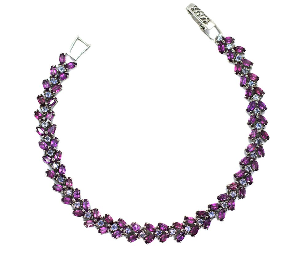 Stříbrný náramek s fialovými kameny, stříbro ryzosti 925/1000, váha 13,31g. Šířka náramku 0,6cm. Délka náramku 18,5cm.