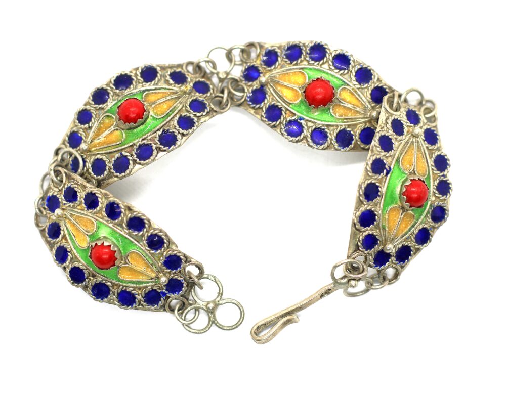 Stříbrný náramek se smaltem, ryzost stříbra 925/1000, kroužky jsou ve stříbře o ryzosti 700/1000 – Osvědčení z PÚ, váha celkem 10,74 g, délka náramku je 18 cm.