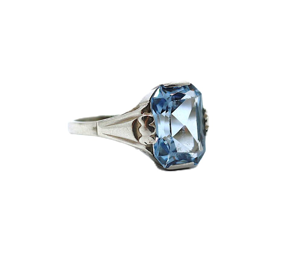 Stříbrný prsten se syntetickým akvamarinem, Art Deco. Stříbro ryzosti 800/000, váha celkem 3,80g. Velikost hlavy prstenu 1,4cm. Velikost prstenu 55. V případě zájmu je možná úprava velikosti prstenu.