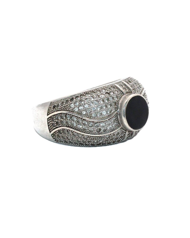 Stříbrný prsten s černým smaltem a zirkony, ryzost stříbra 925/1000, váha 7,31 g, velikost prstenu je 63.