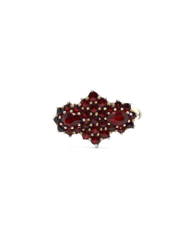 Stříbrný prsten s českými granáty, ryzost stříbra 925/1000, váha 2,52 g, velikost prstenu je 54, velikost hlavy prstenu je 1,8 cm.