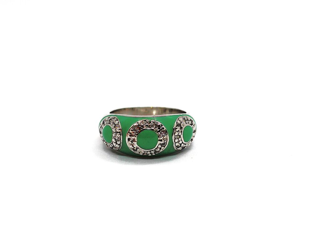 Stříbrný prsten zdobený zeleným smaltem a zirkony. Stříbro ryzosti 925/1000, váha 6,58g. Šířka prstenu 1cm, velikost prstenu 56.