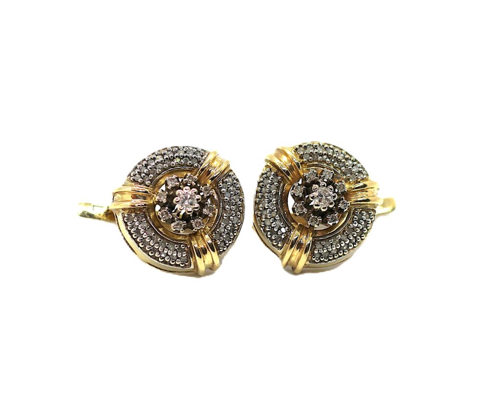 Zlaté, velké náušnice s brilianty, žluté zlato ryzosti 585/1000, váha 10,76g. Brilianty celkem cca 0,35ct. Velikost ozdobné části 1,8cm. Francouzské zapínání.