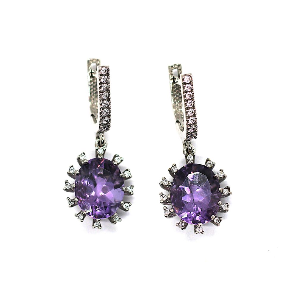 Zlaté náušnice s ametystem a zirkony, bílé zlato o ryzosti 585/1000, váha 5,18 g, velikost náušnic je 3 cm.