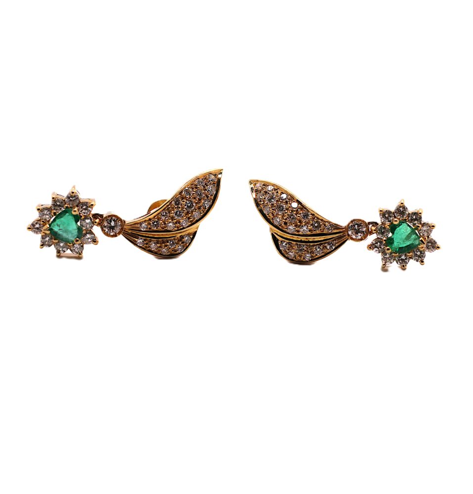 Zlaté náušnice s brilianty a smaragdy, smaragdy ve tvaru srdíčka, brilianty celkem 0,82 ct, ryzost zlata 750/1000, váha 6,74 g, velikost náušnic je 3 cm, šroubovací uzávěr.