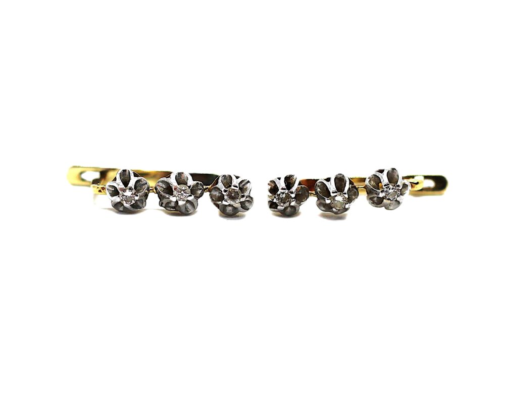Zlaté náušnice s brilianty, zlato ryzosti 750/1000, váha 3,90g. Brilianty – 6×0,03ct. Velikost náušnice 1,8cm.