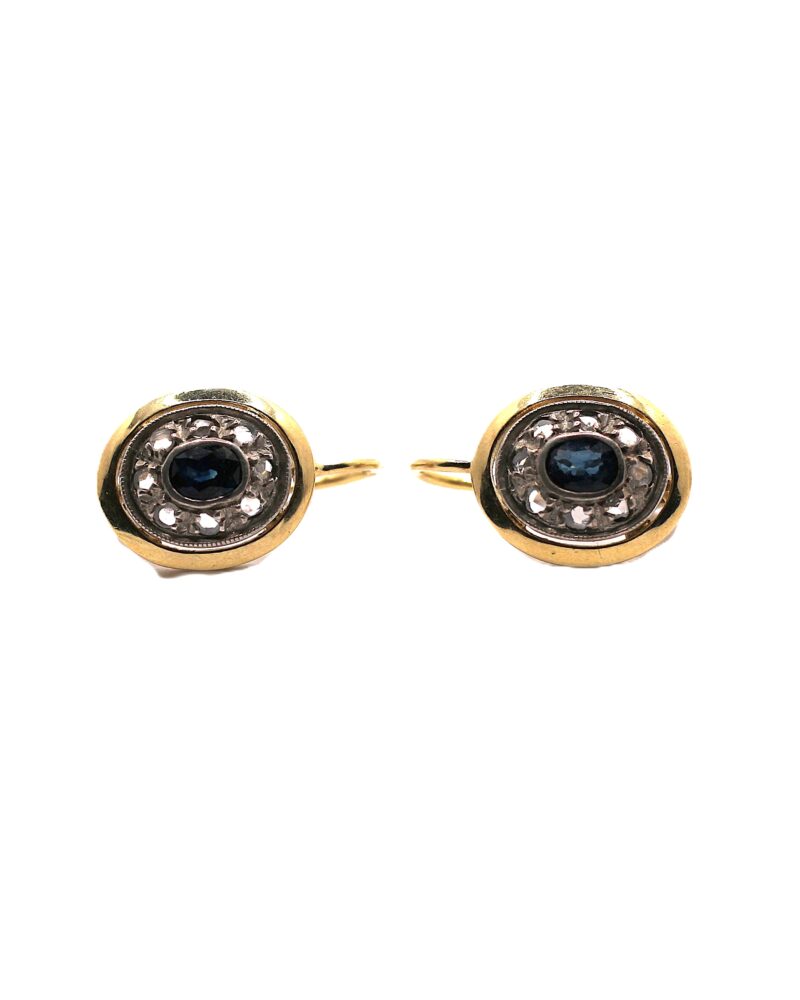 Zlaté náušnice s diamanty a safíry, diamanty 16 x 0,015 ct, ryzost zlata 750/1000, váha 4,80 g, velikost náušnic je 2 cm.