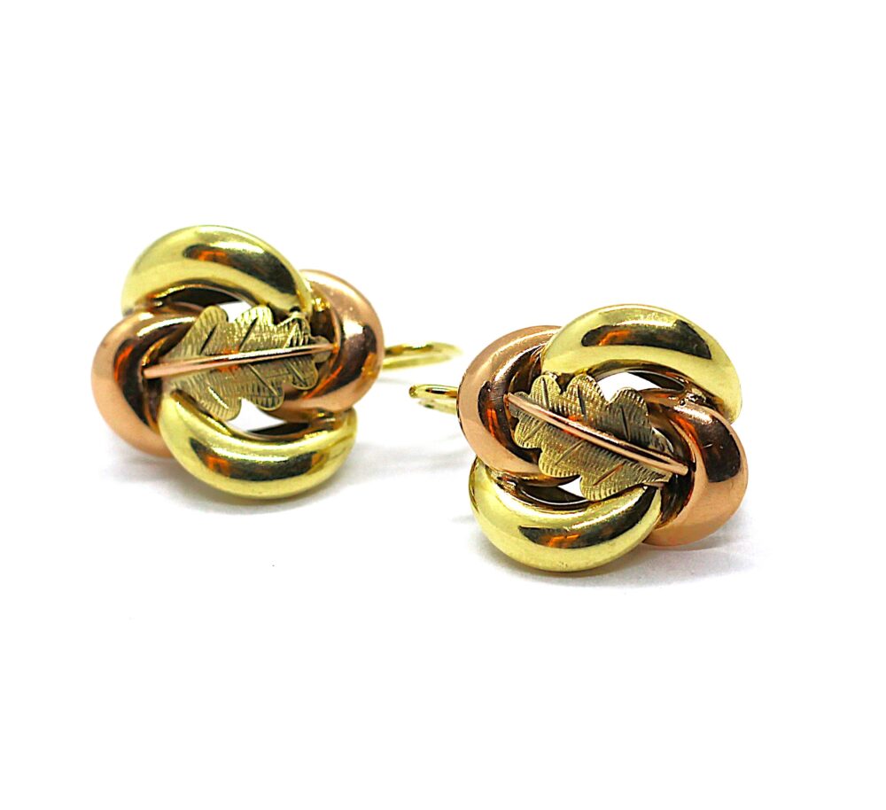 Zlaté náušnice, uzel s motivem listu. Žluté a růžové zlato ryzosti 585/1000, váha 6,60g. Velikost ozdobné části 1,8cm, vč. ouška 2,2cm. Perfektní stav.