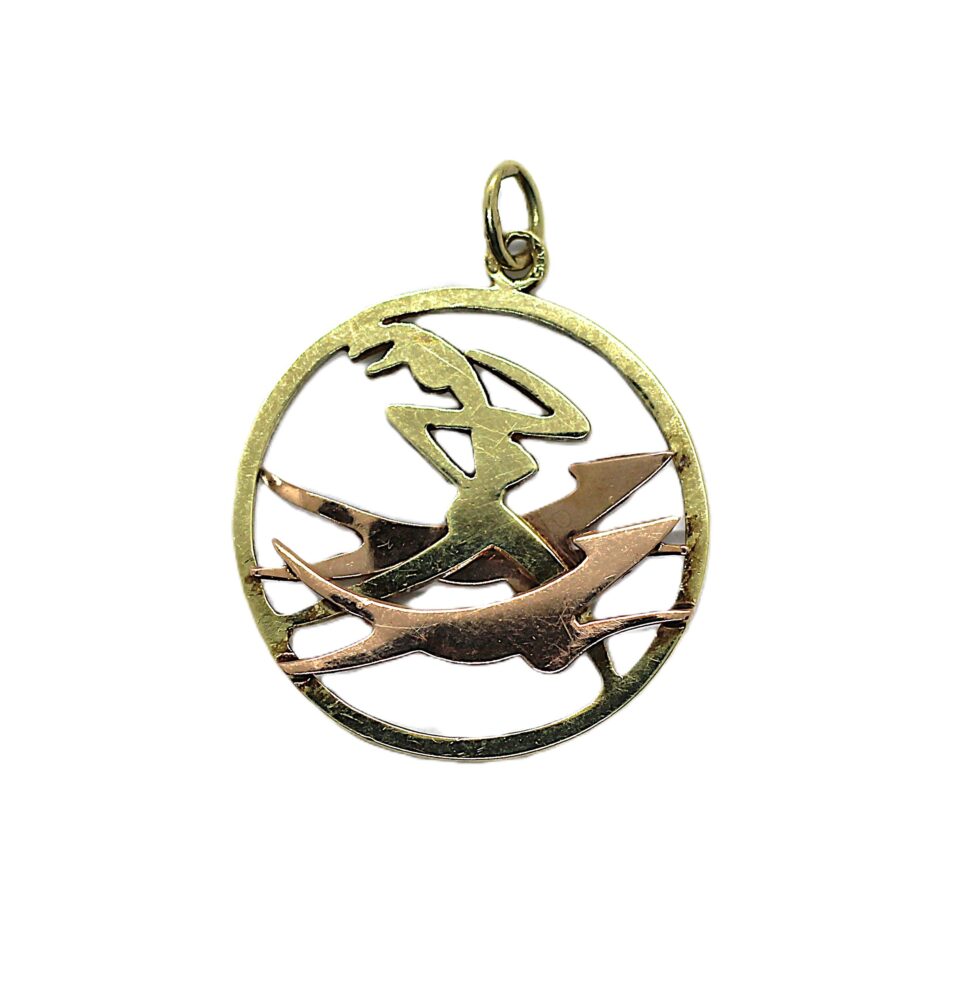 Zlatý přívěs – Diana na lovu, ryzost zlata 585/1000, váha 2,45 g, velikost přívěsu s ouškem je 3 cm.