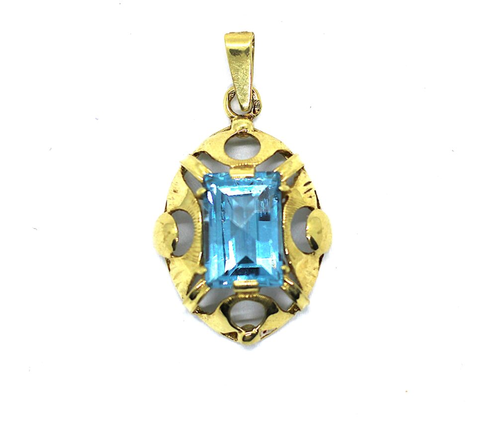 Zlatý přívěs s akvamarínem. ryzost zlata 585/1000, váha 4,07 g, velikost přívěsu i s ouškem je 3,5 cm.