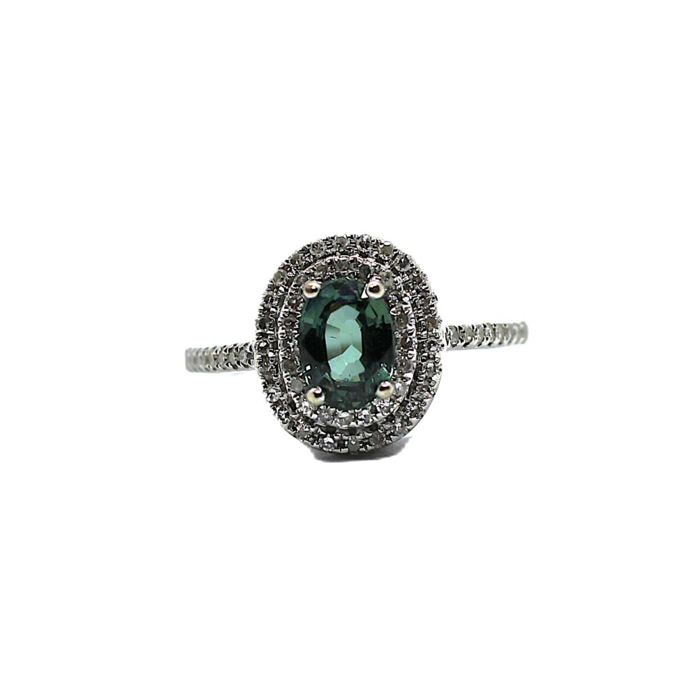 Zlatý prsten s brilianty a cejlonským safírem, brilianty celkem 0,15 ct, bílé zlato o ryzosti 585/1000, váha 4,24 g, velikost prstenu je 53, velikost hlavy prstenu je 1,2 cm.
