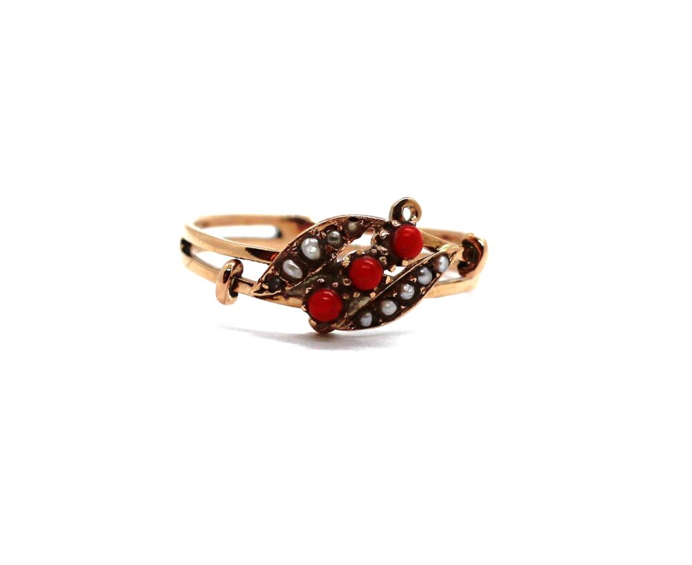 Secesní zlatý prsten s korály a perličkami, růžové zlato ryzosti 585/1000, váha 1,86g. Šířka prstenu 0,7cm. Velikost prstenu 55.