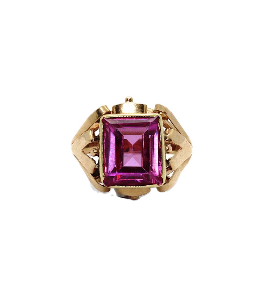 Zlatý prsten se syntetickým rubínem, ryzost zlata 585/1000, váha 5,30 g, velikost prstenu je 62, velikost hlavy prstenu je 1,5 cm.