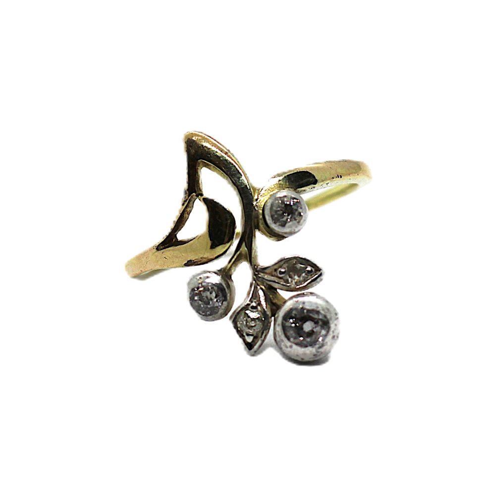 Zlatý, secesní prsten s brilianty, brilianty celkem 0,33 ct, ryzost zlata 585/1000, váha 3,44 g, velikost prstenu je 55,5, velikost hlavy prstenu je 2 cm.